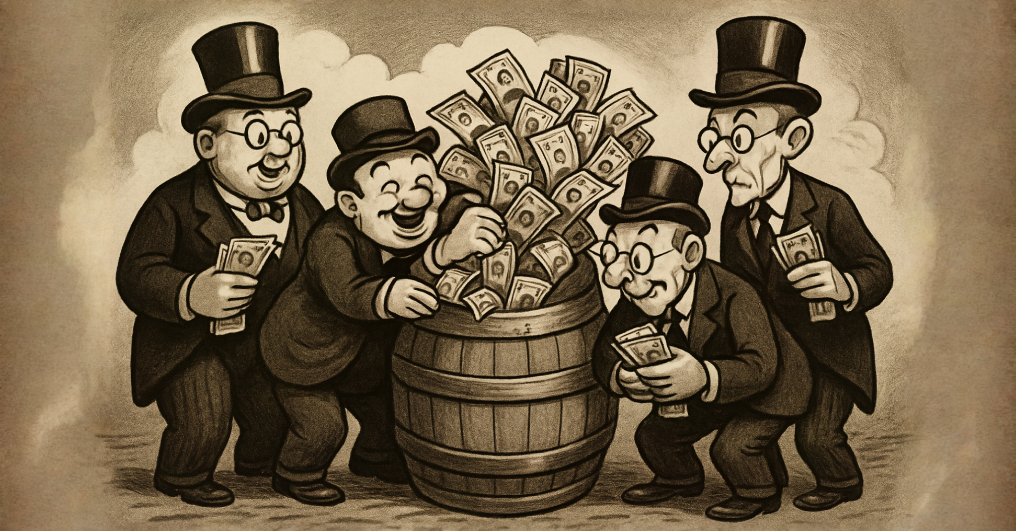 1930s Cartoon Wealthy Tycoons Stuffing Wine Barrel 04 August 6, 2025 Tincknell Wine tycoons stuffing money into a wine barrel.